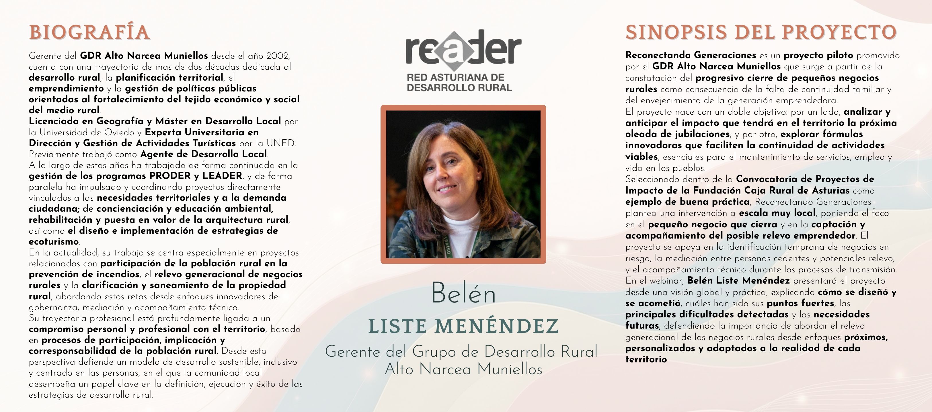 Por su parte, Belén Liste es gerente de este grupo de desarrollo desde 2002, con una trayectoria de más de dos décadas dedicada al desarrollo rural, la planificación territorial, el emprendimiento y la gestión de políticas públicas orientadas al fortalecimiento del tejido económico y social del medio rural.
